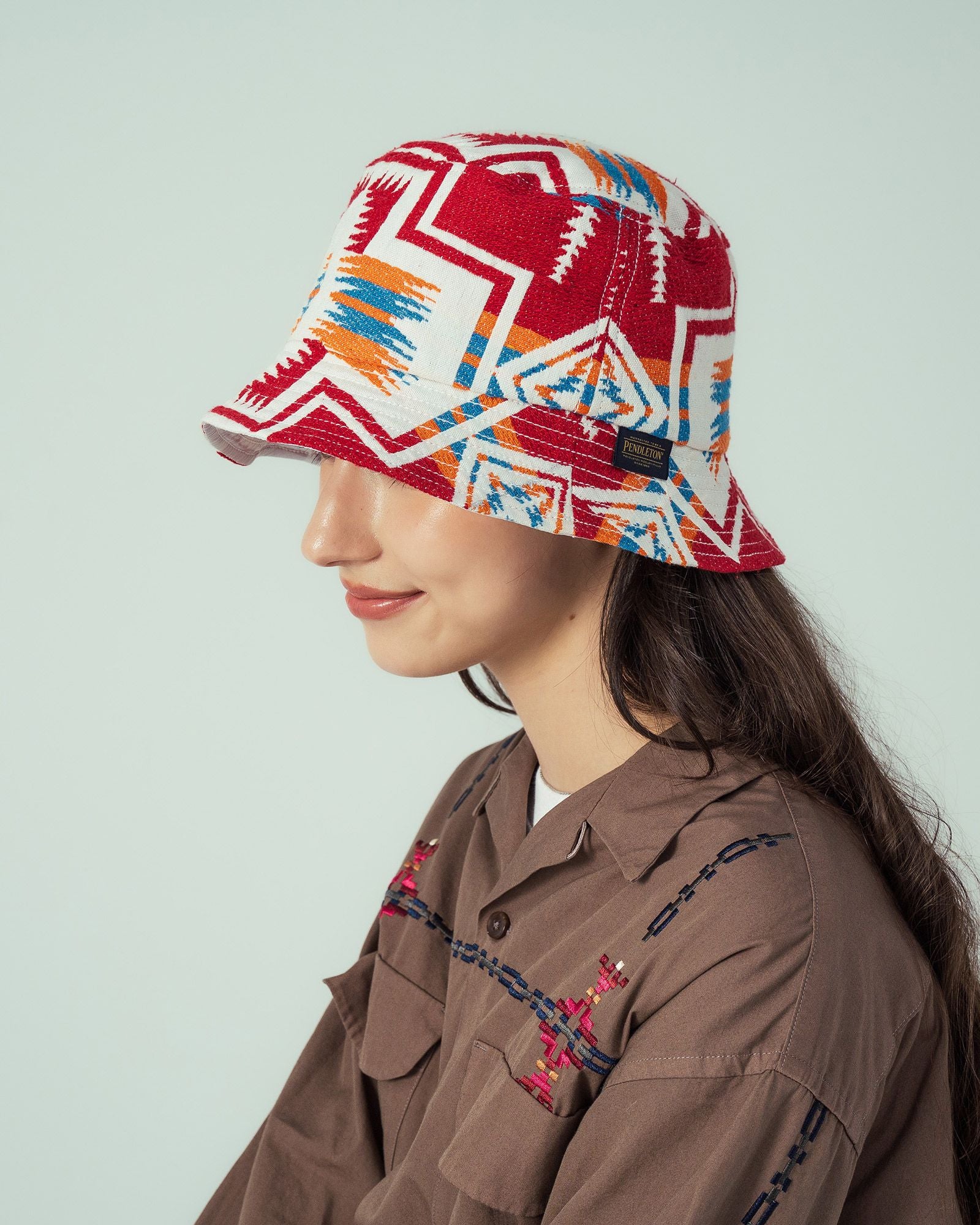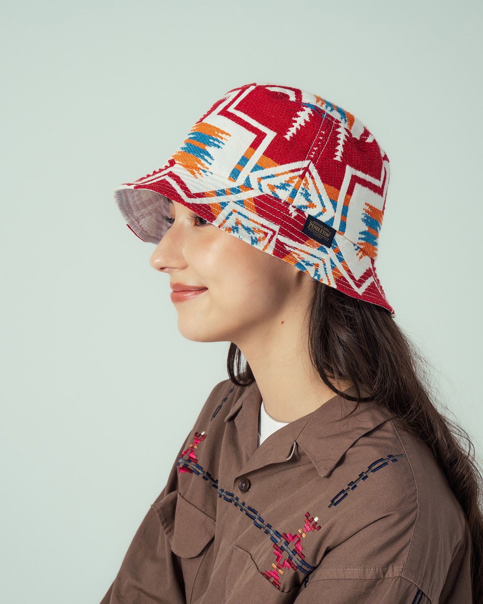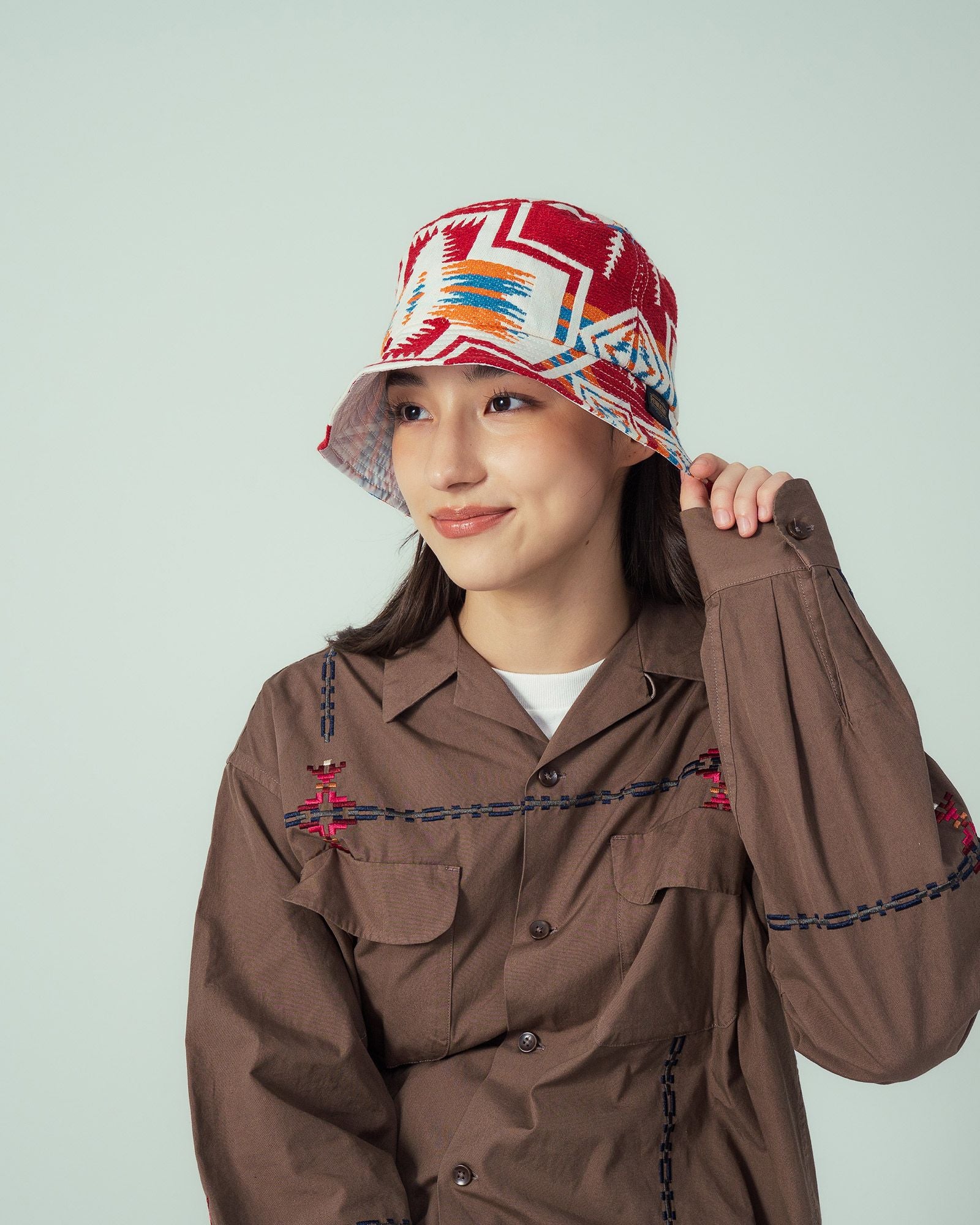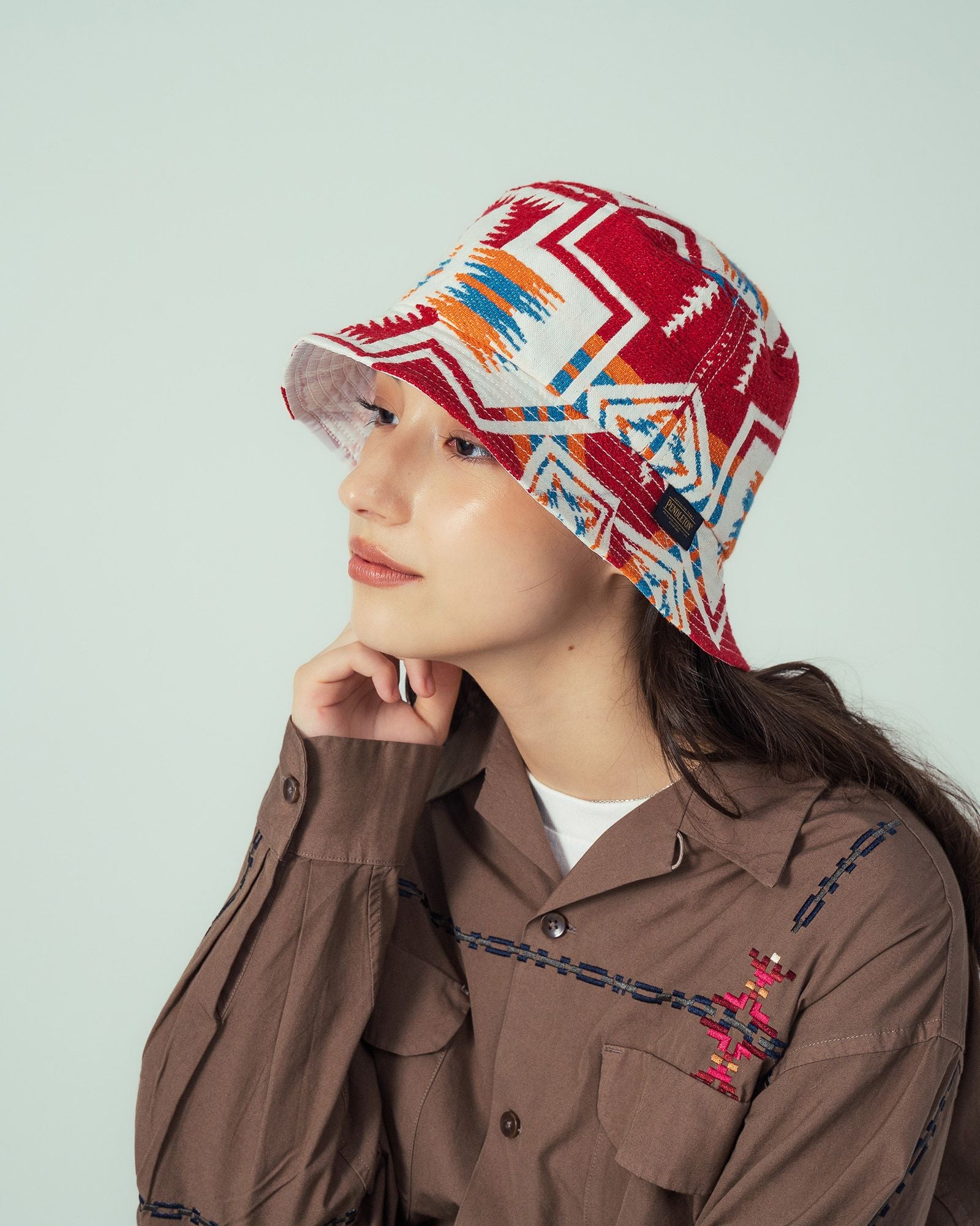 Pendletonの伝統的な柄を落とし込んだバゲットハット。ジャガードが織りなす色鮮やかな伝統柄が目を惹きます。鮮やかなテクスチャーがコーディネートにアクセントを加え、毎日の装いを格上げします。