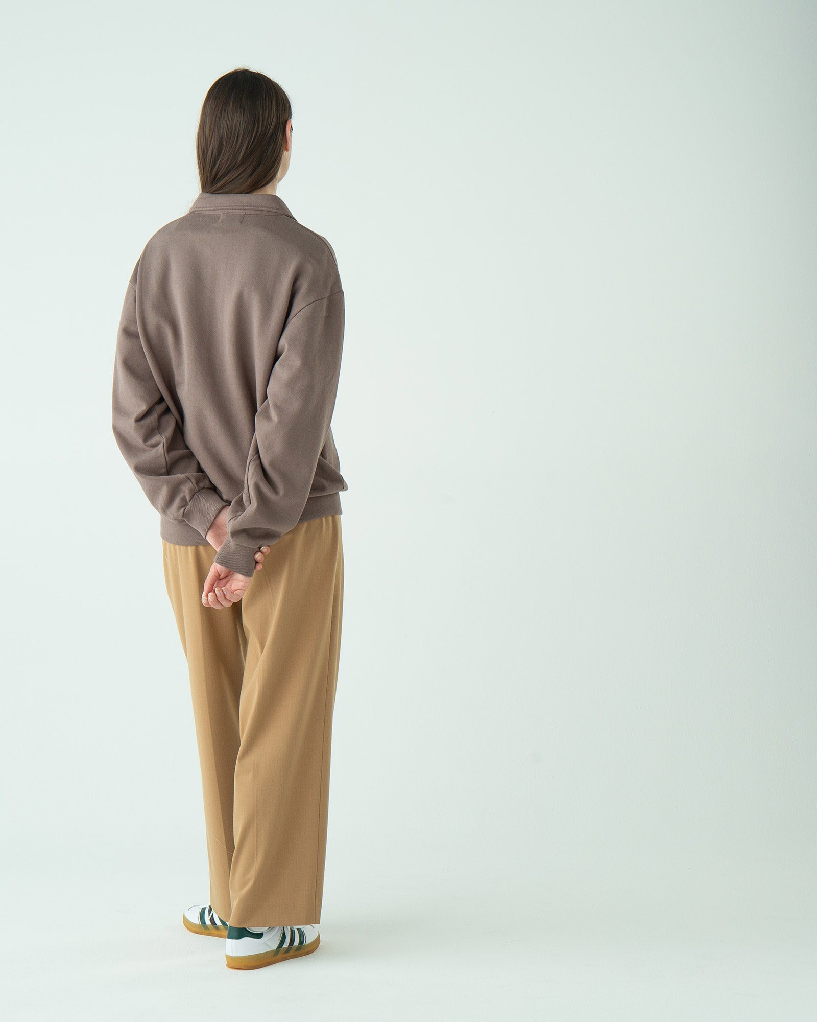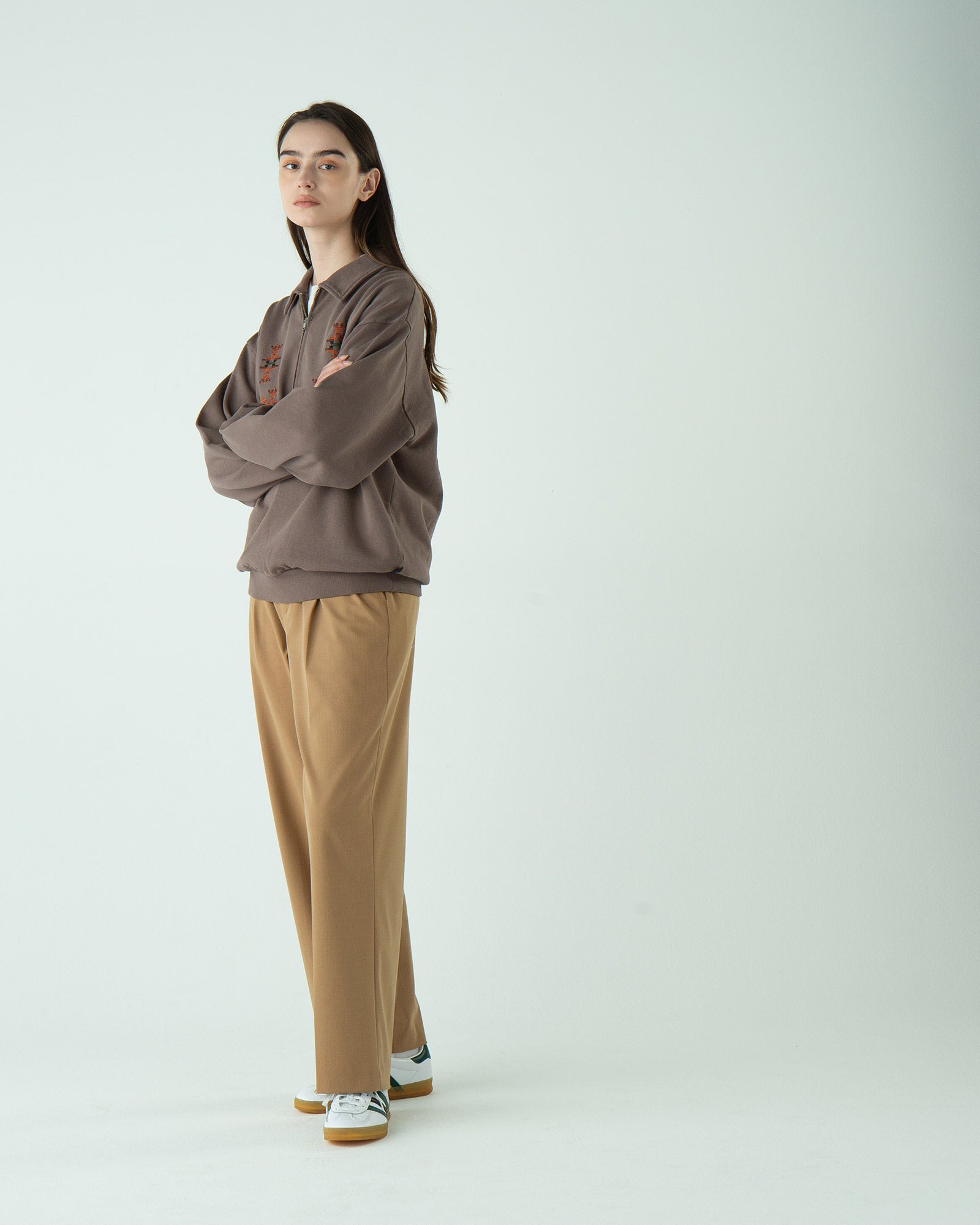 ハーフジップの“スポーティ要素”に、きれいめボトムで洗練された印象に仕上げたシンプルモードスタイル。