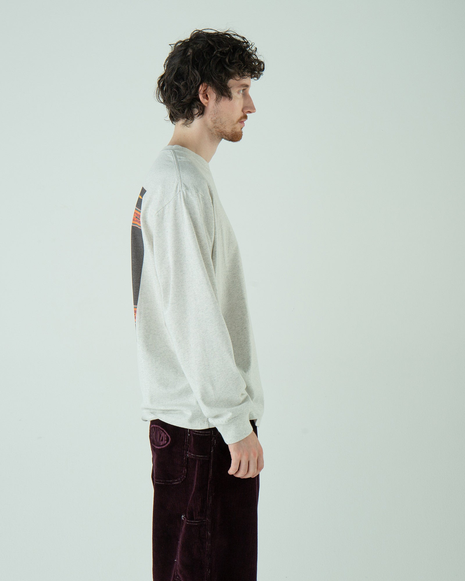 バックプリントロングスリーブT × ダメージデニム × スニーカー