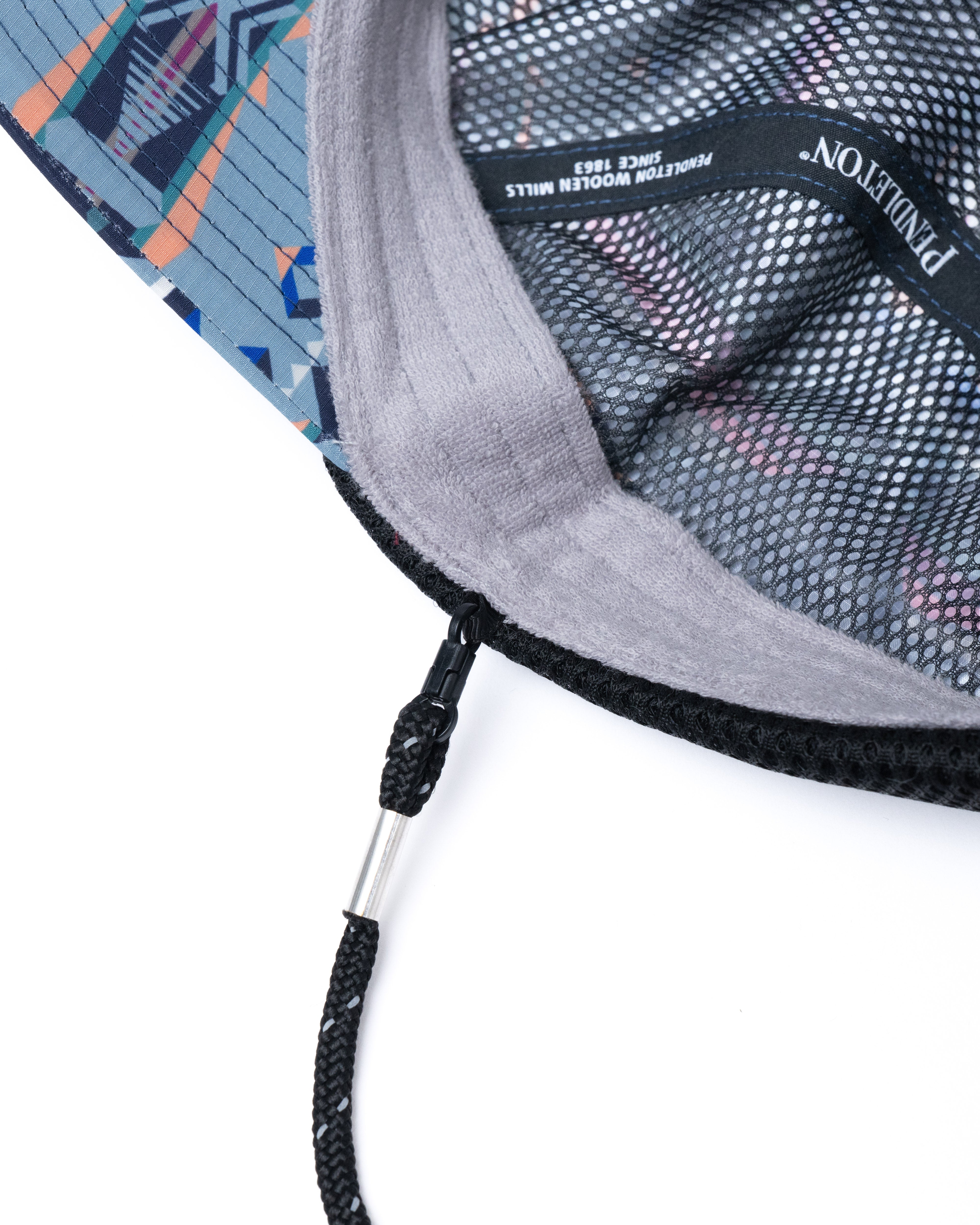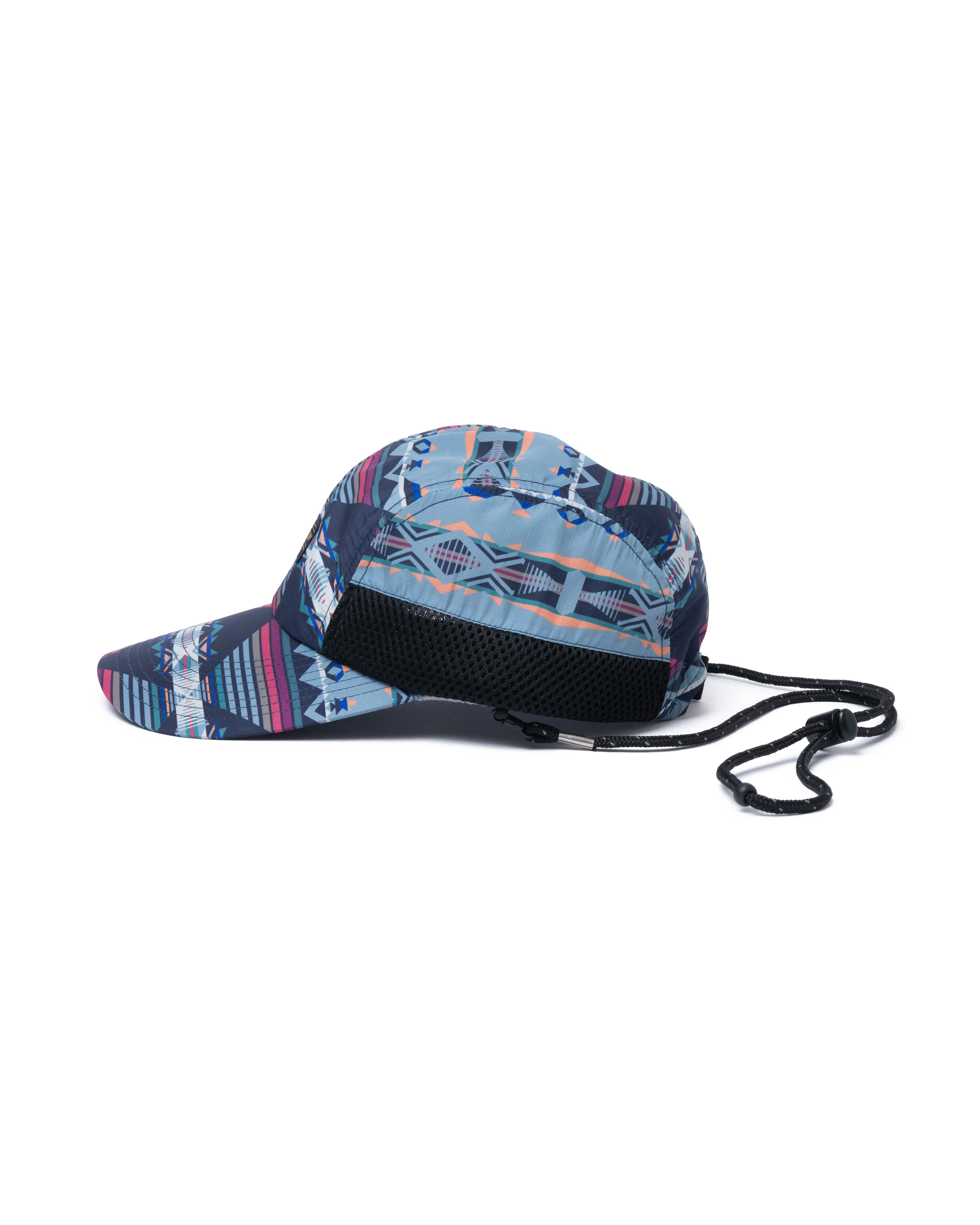 ペンドルトンの伝統的なネイティブ柄を、薄手で軽く、ソフトな風合いが特徴のエコペット素材(再生ポリエステル)を使用したリップストップ生地にプリントしたキャップです。