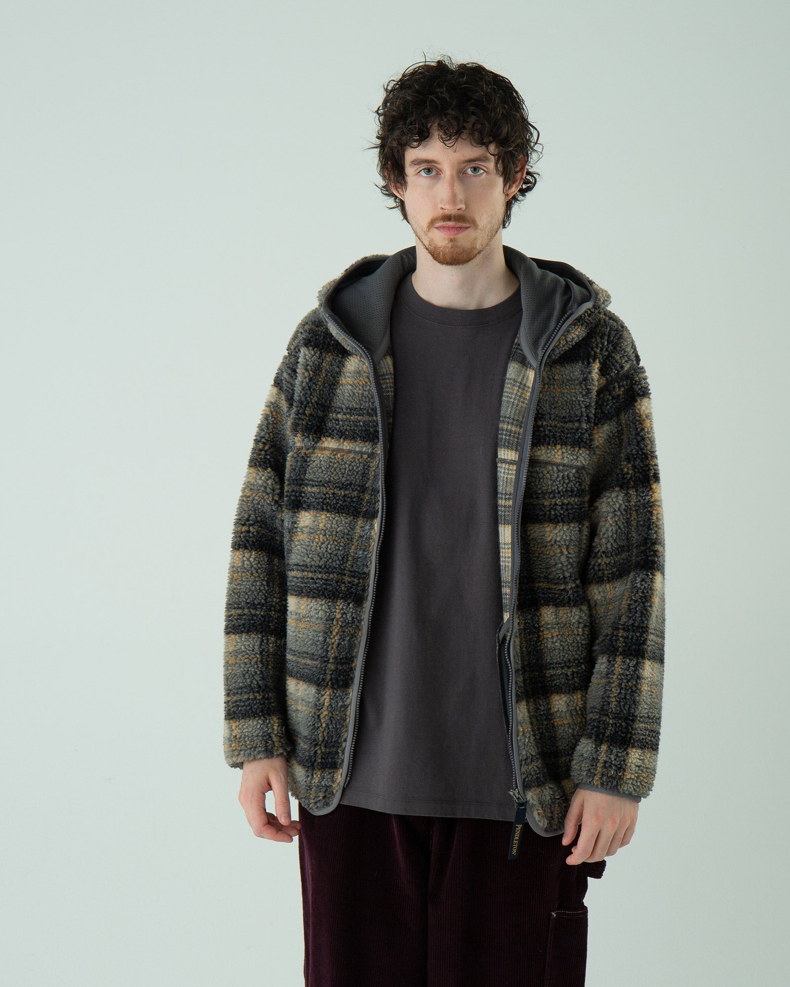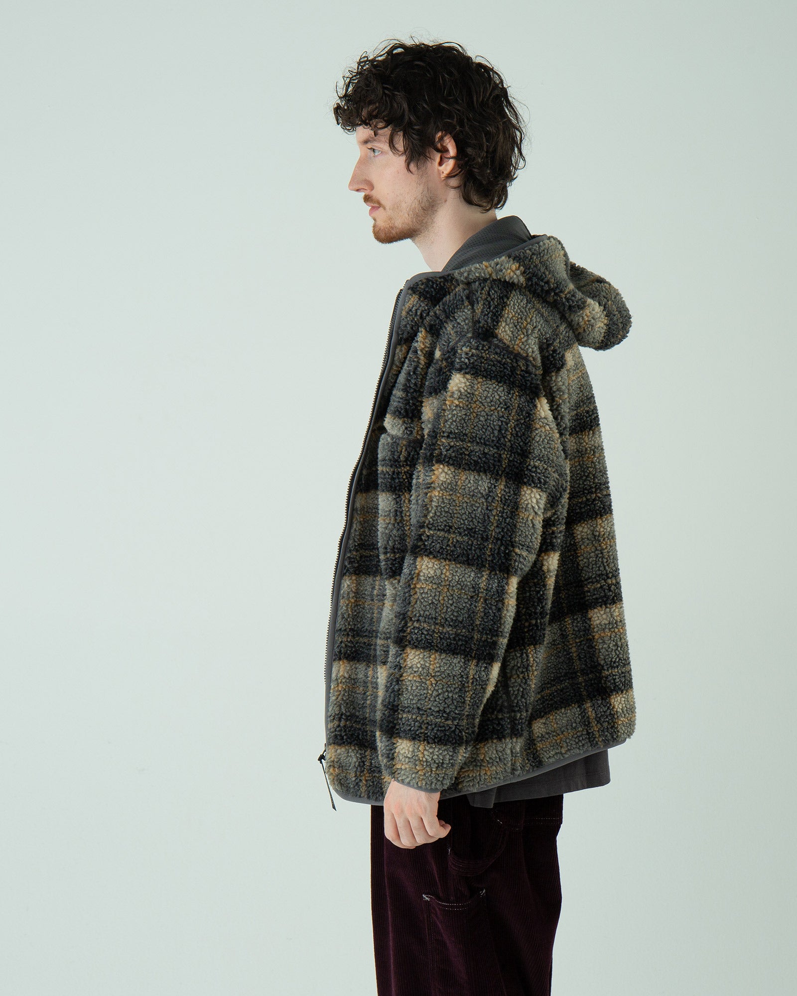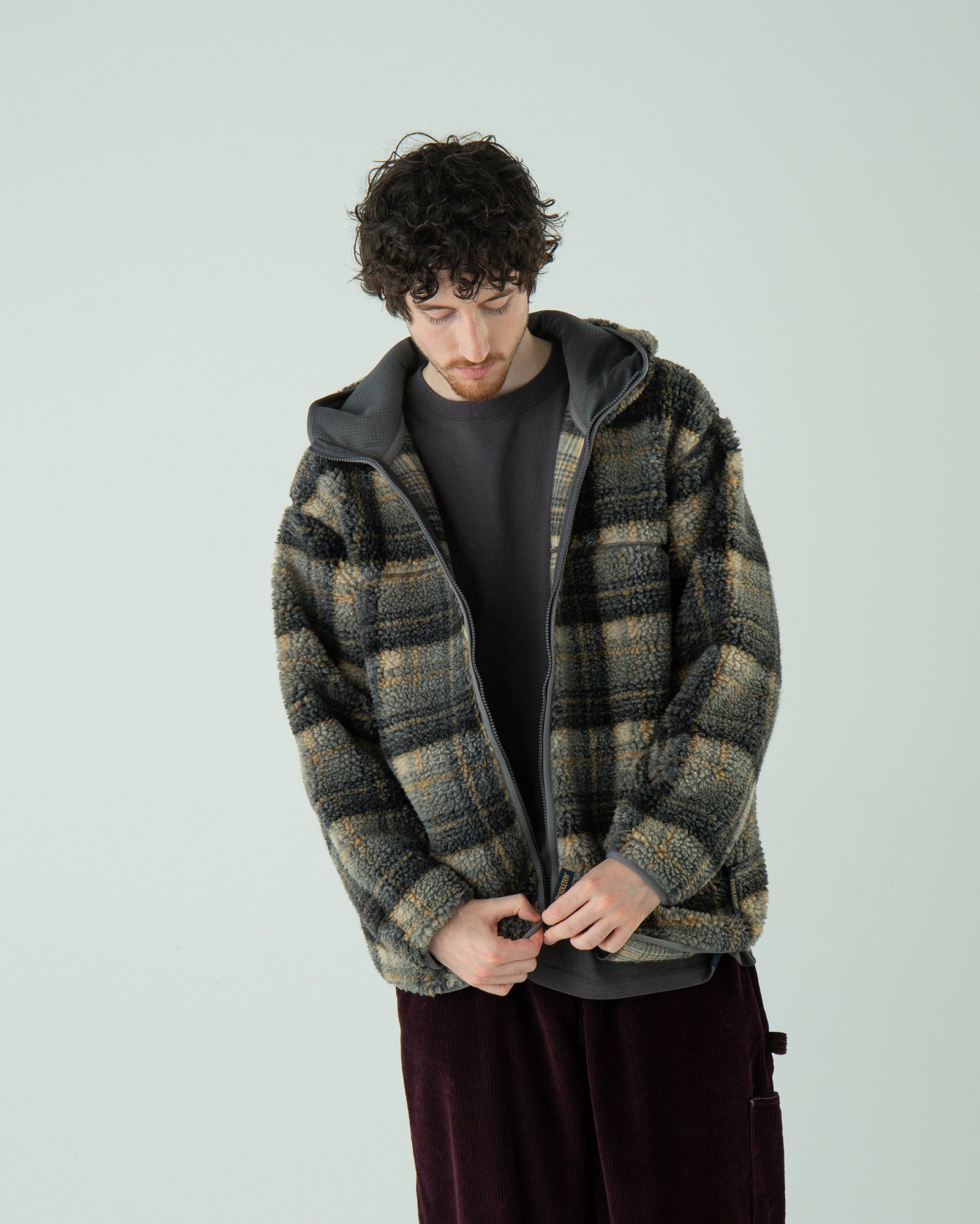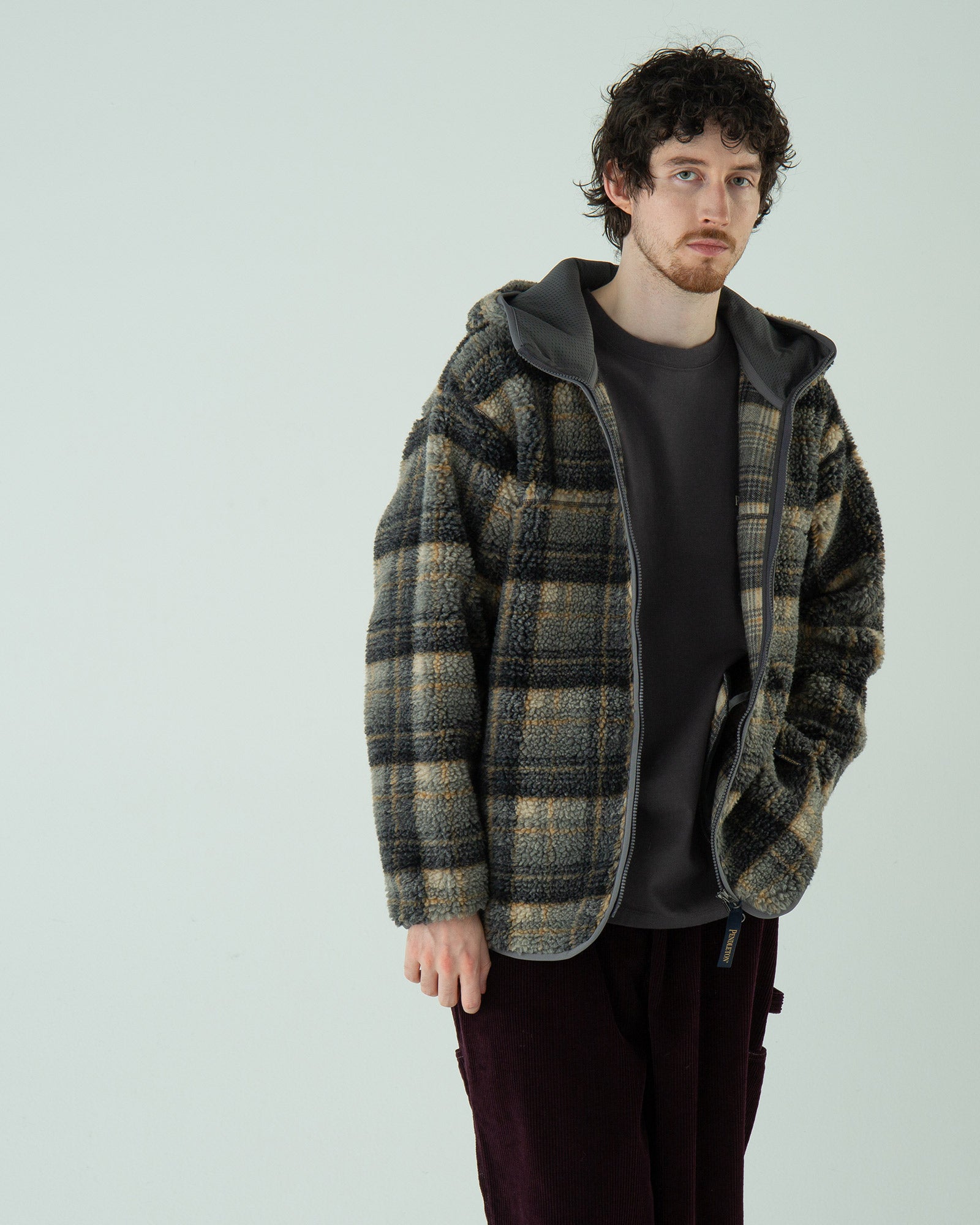 柄ボアを主役に、アウトドアやタウンユースに映えるアクティブスタイル。ニットキャップとの相性も◎。