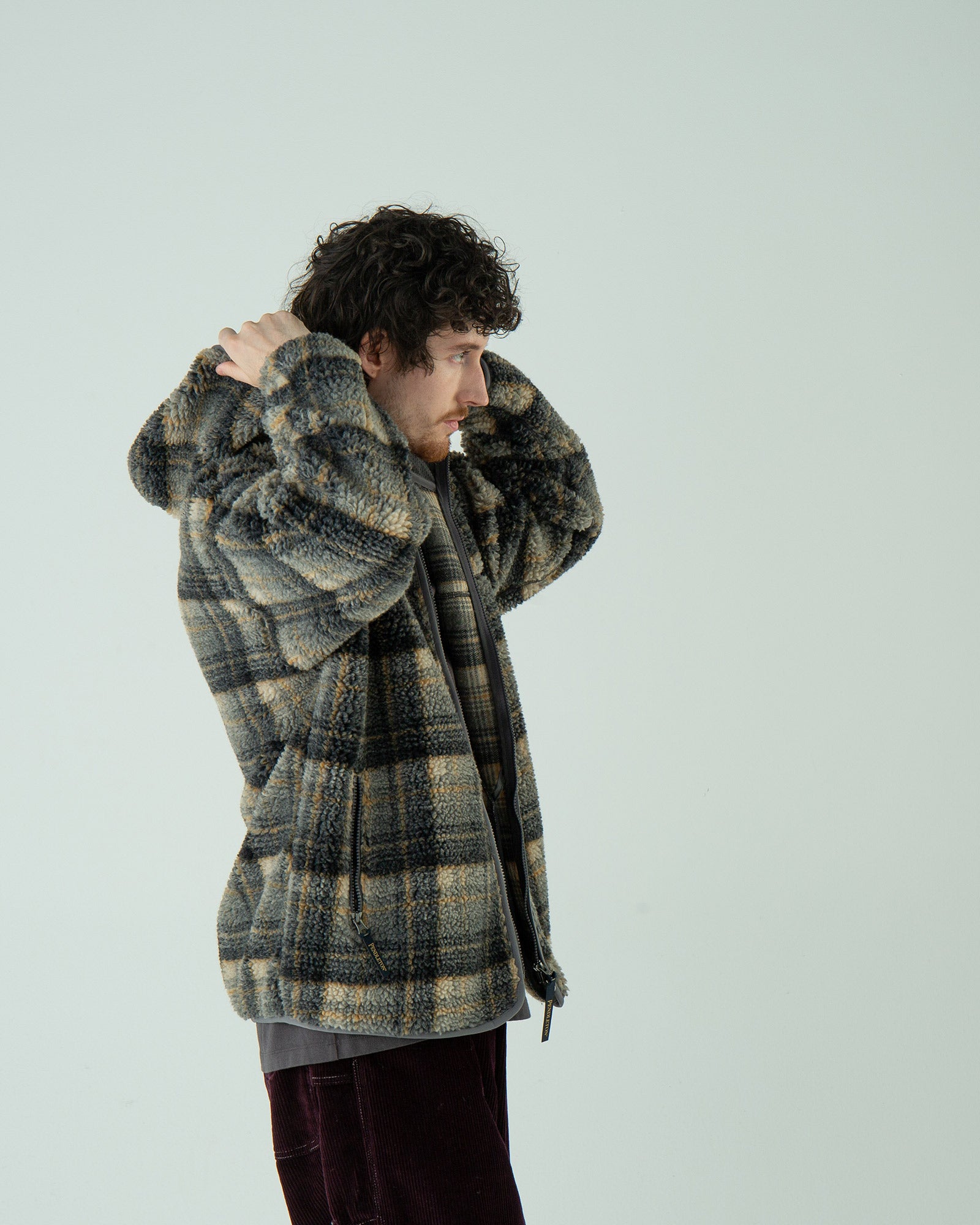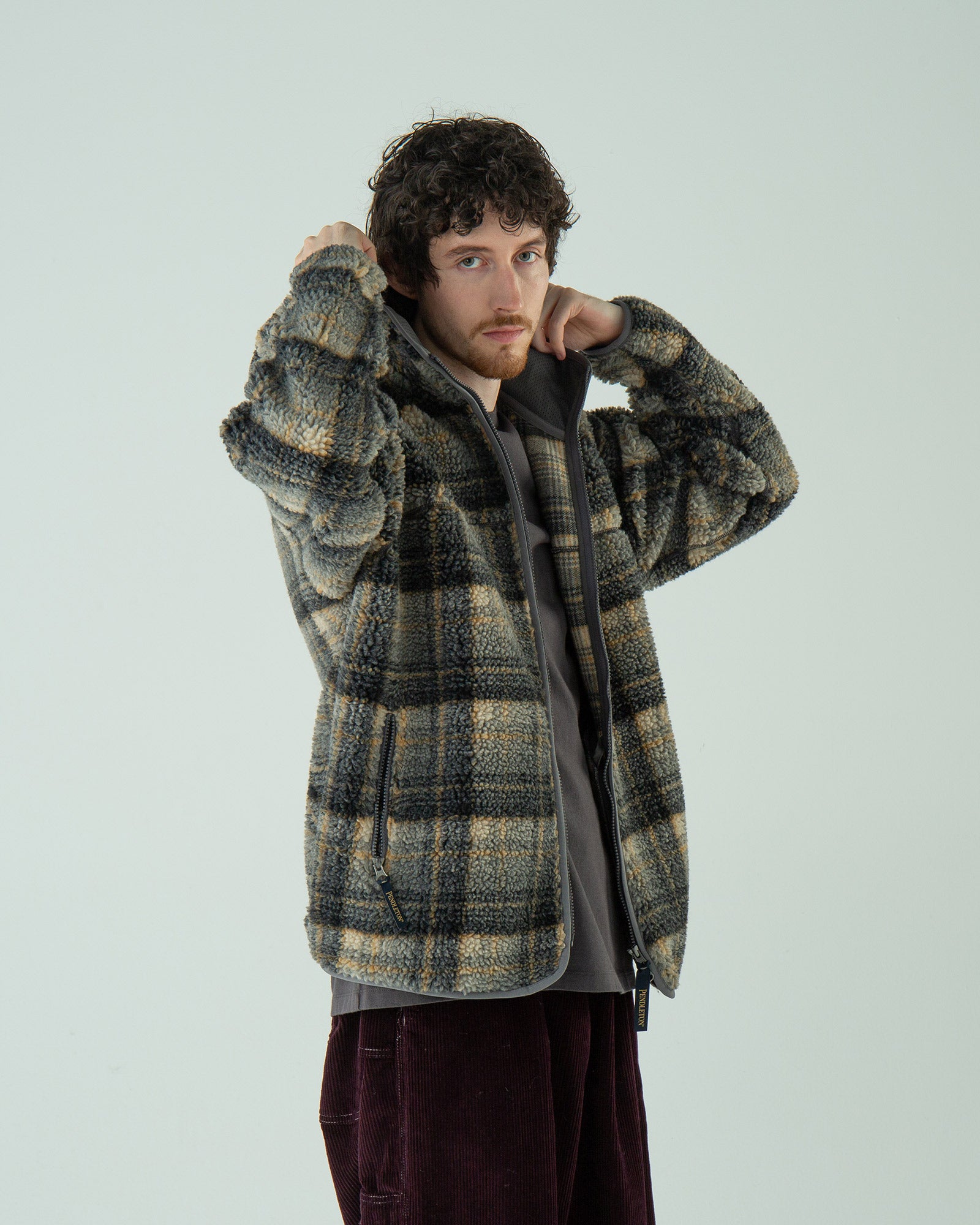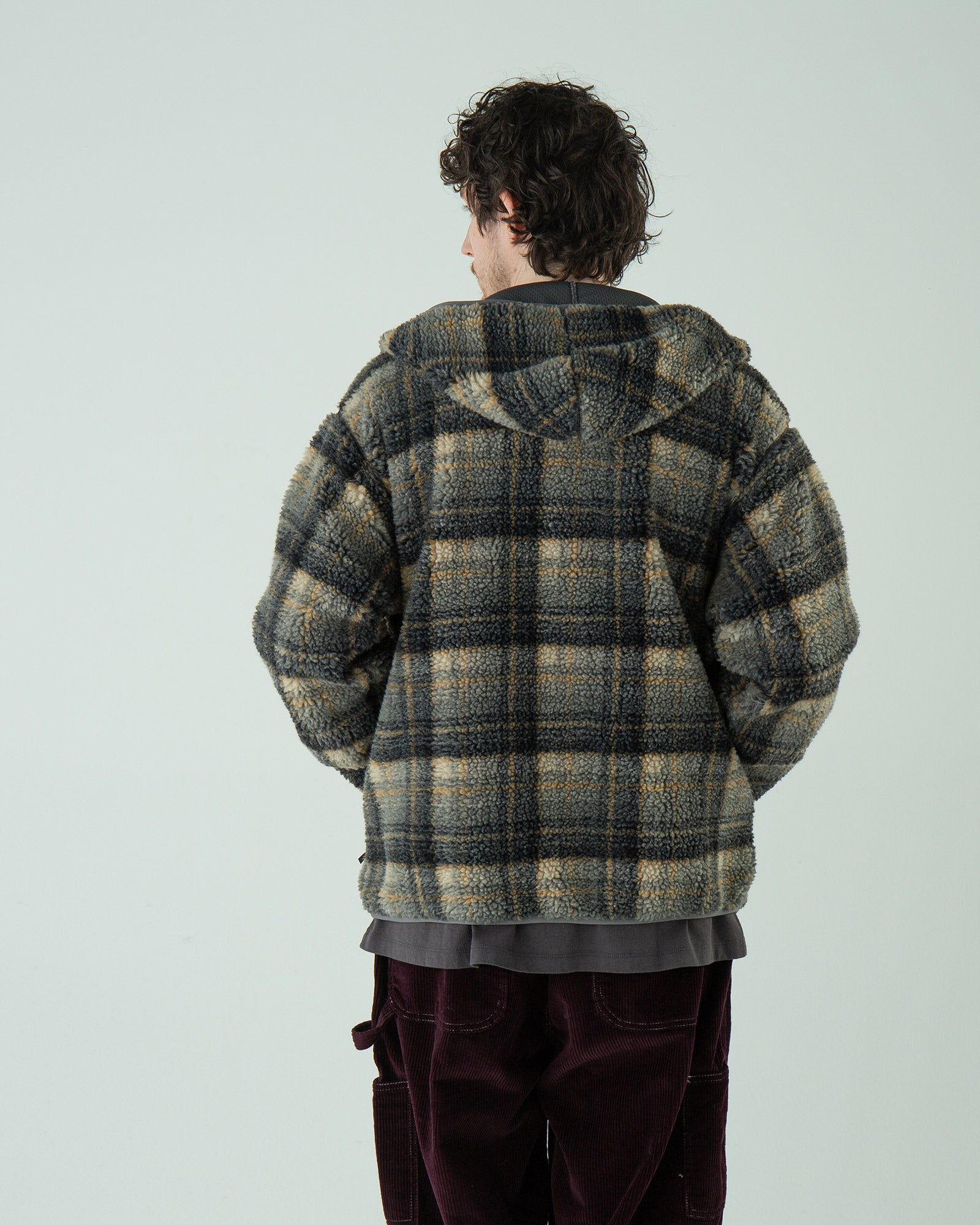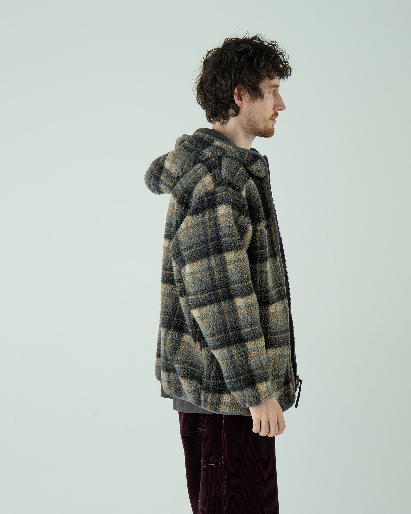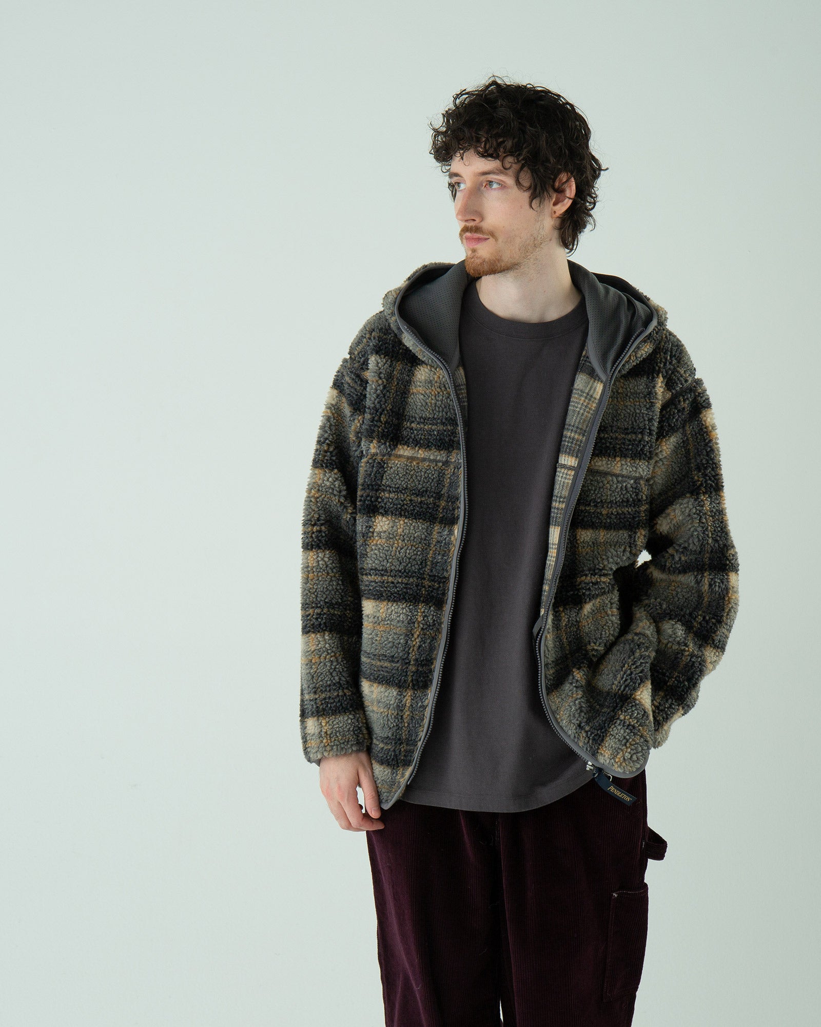 柄ボアを主役に、アウトドアやタウンユースに映えるアクティブスタイル。ニットキャップとの相性も◎。