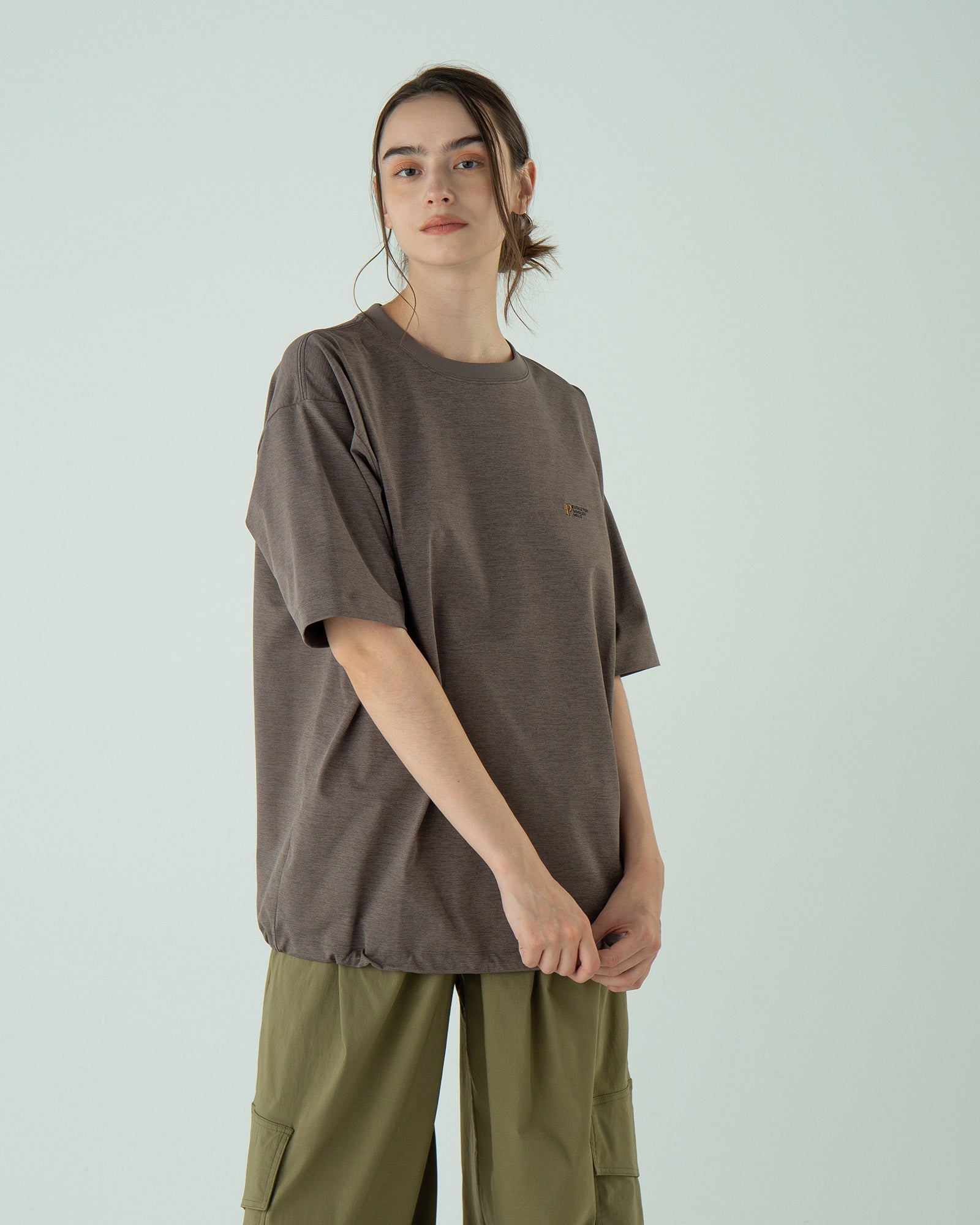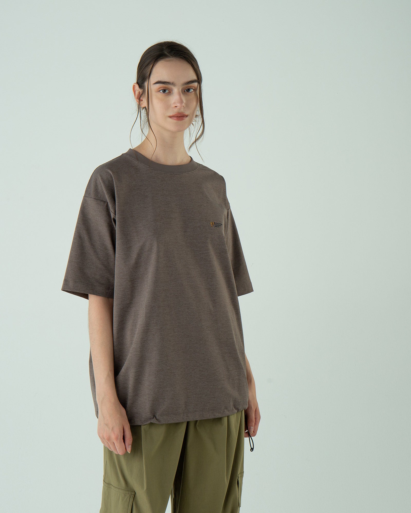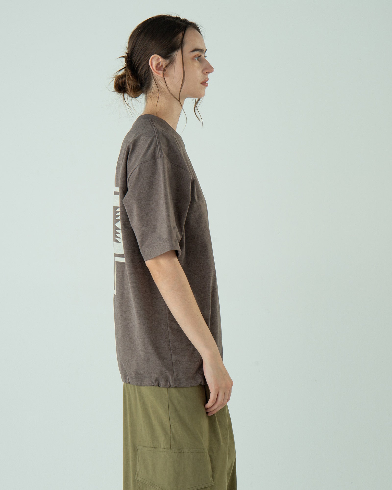 ポリエステルの持つ上品なツヤと落ち感で、カジュアルすぎず上品な印象に。Tシャツなのに“ラフすぎない”、大人の一枚です。