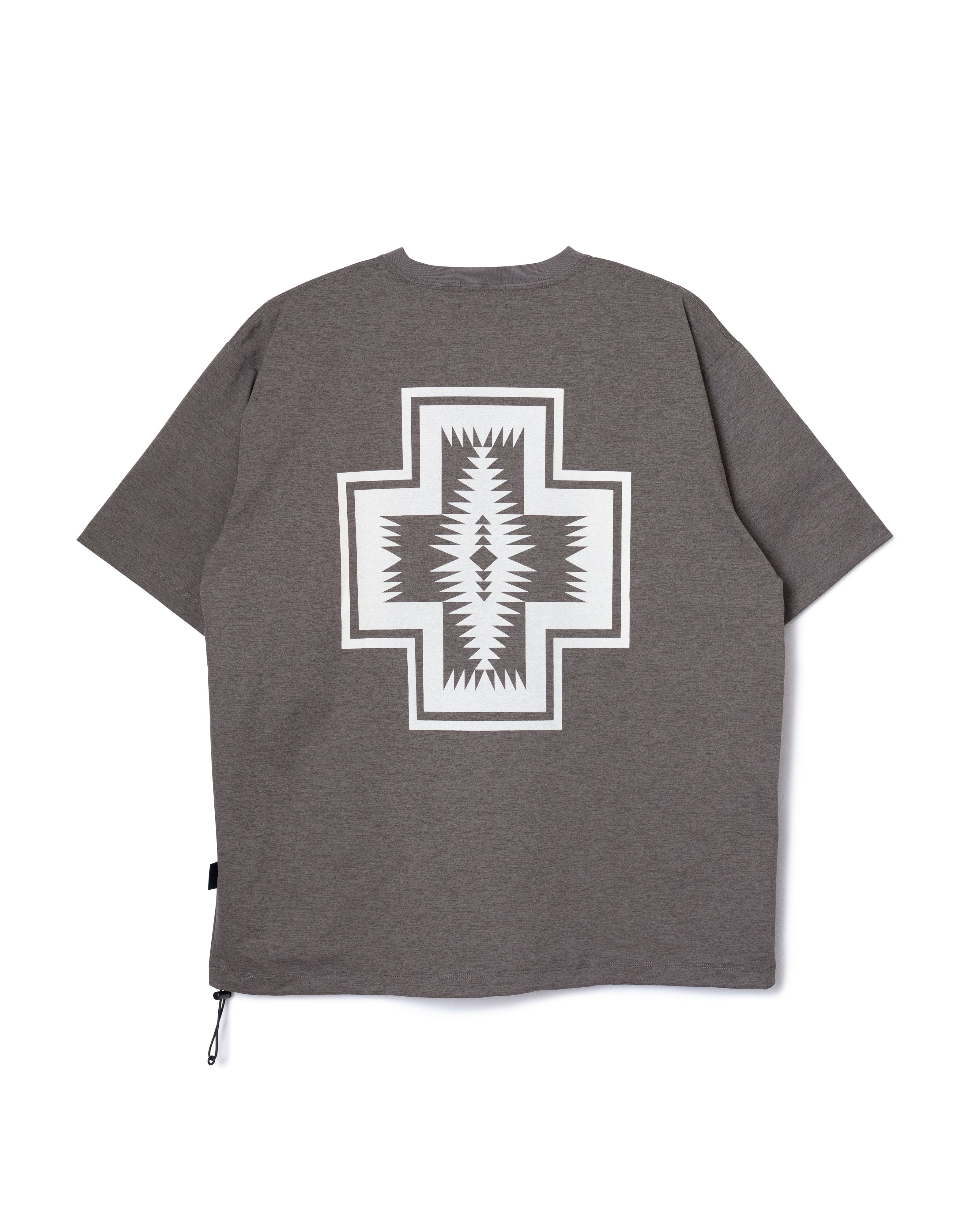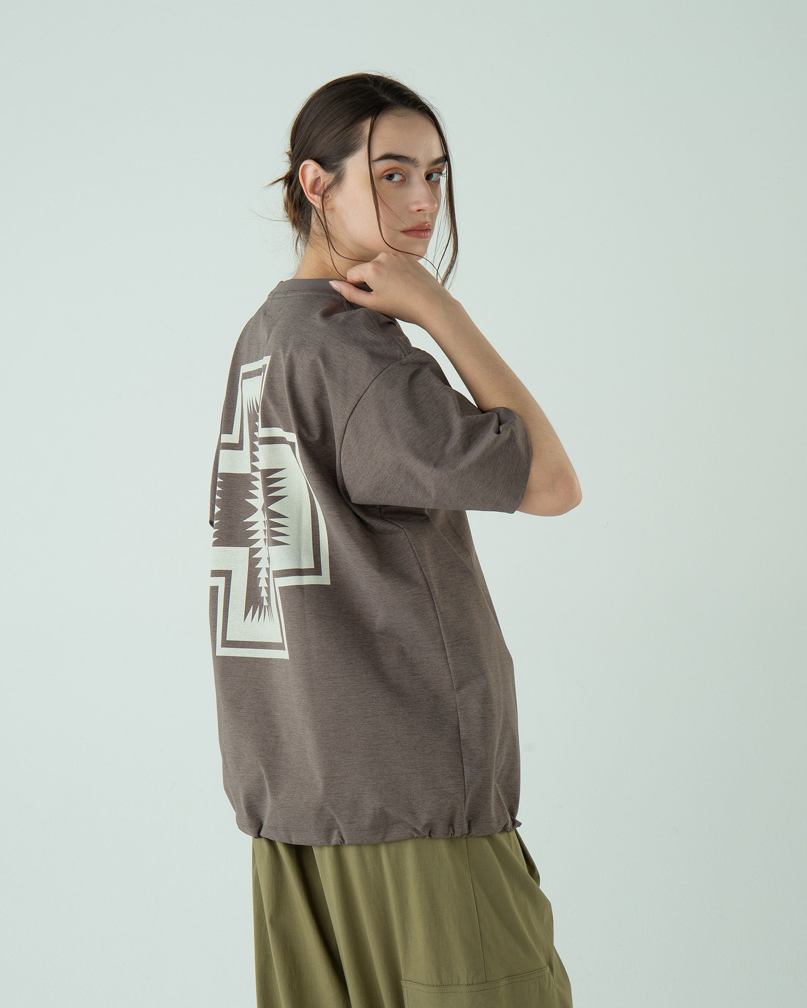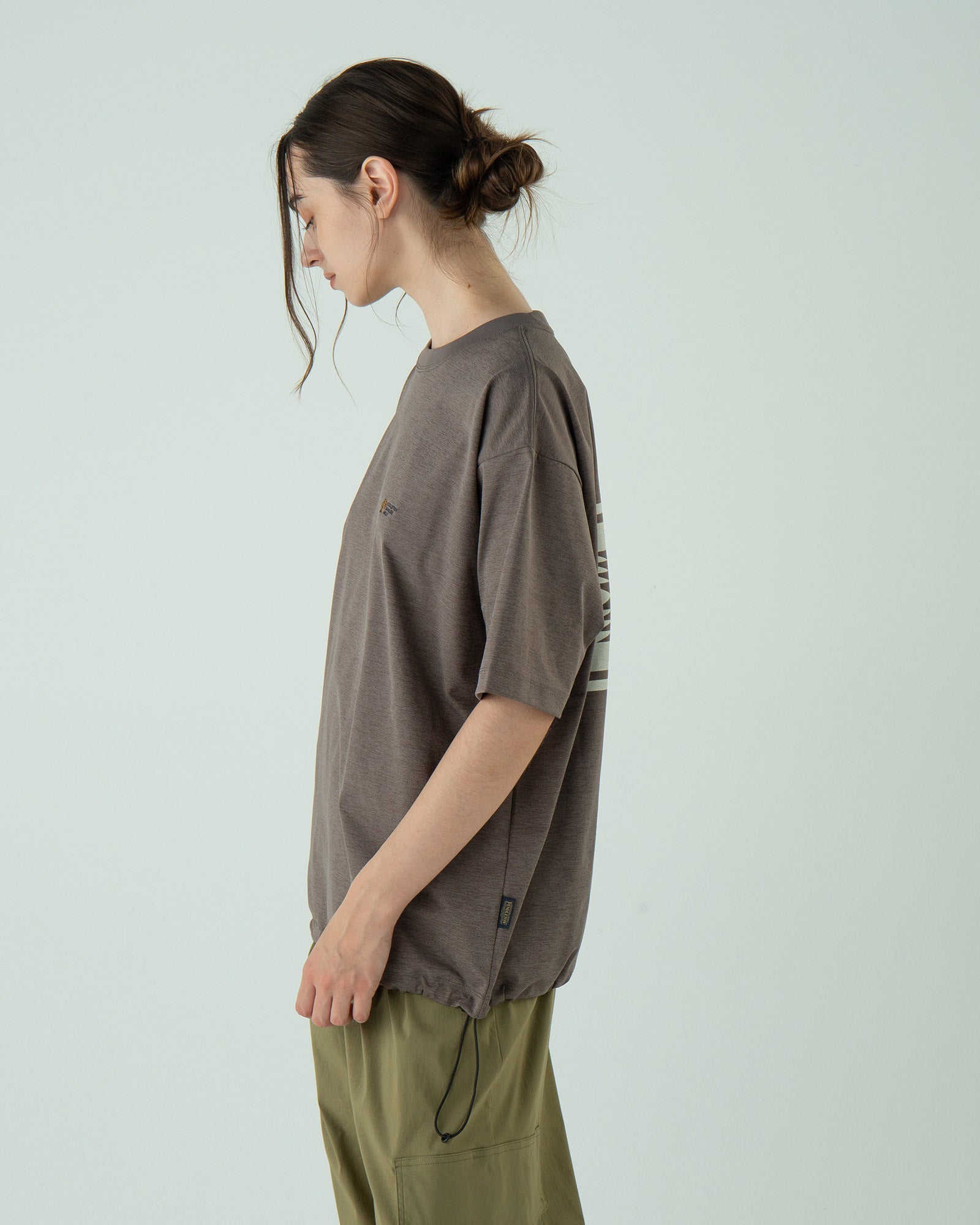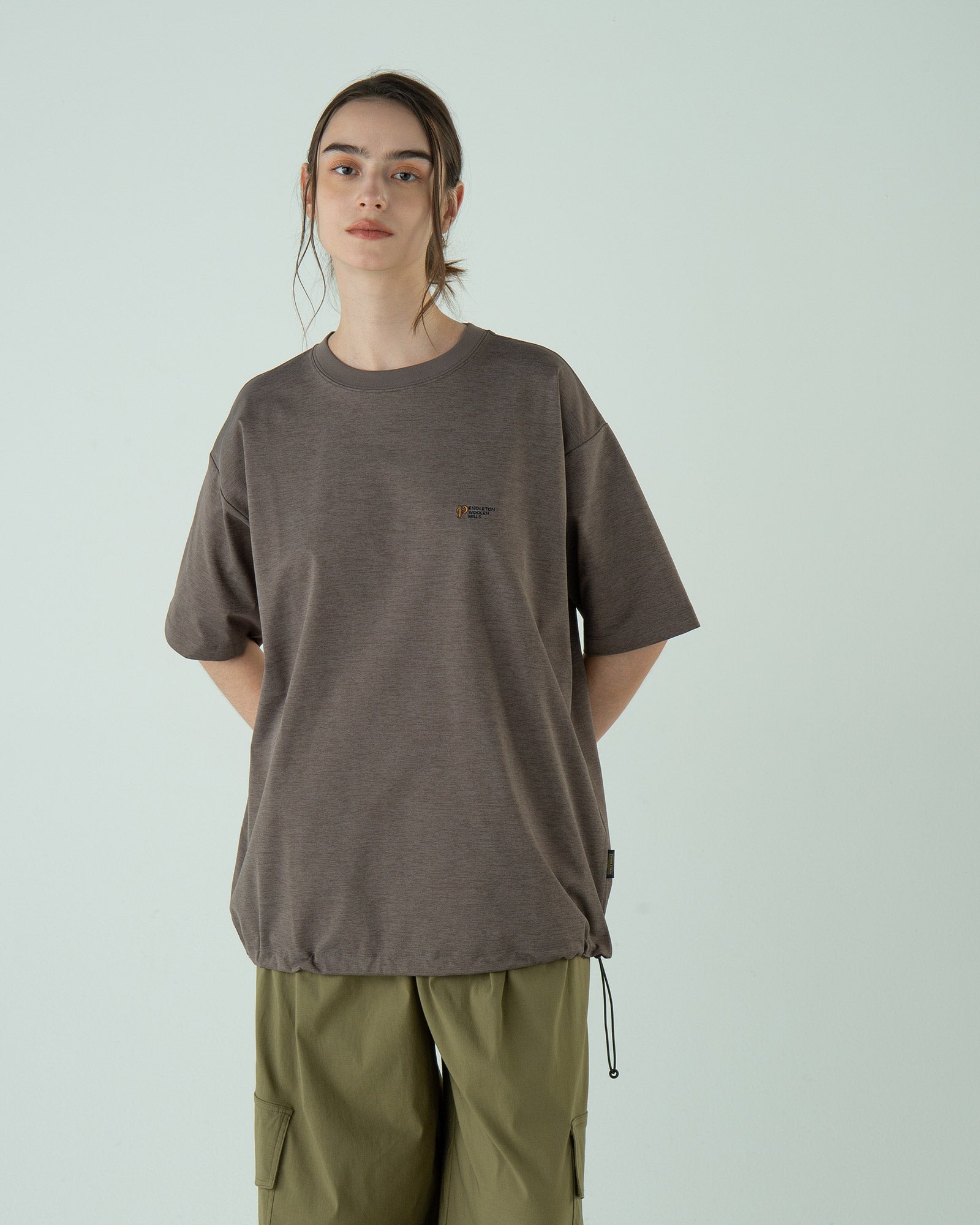 ポリエステルの持つ上品なツヤと落ち感で、カジュアルすぎず上品な印象に。Tシャツなのに“ラフすぎない”、大人の一枚です。