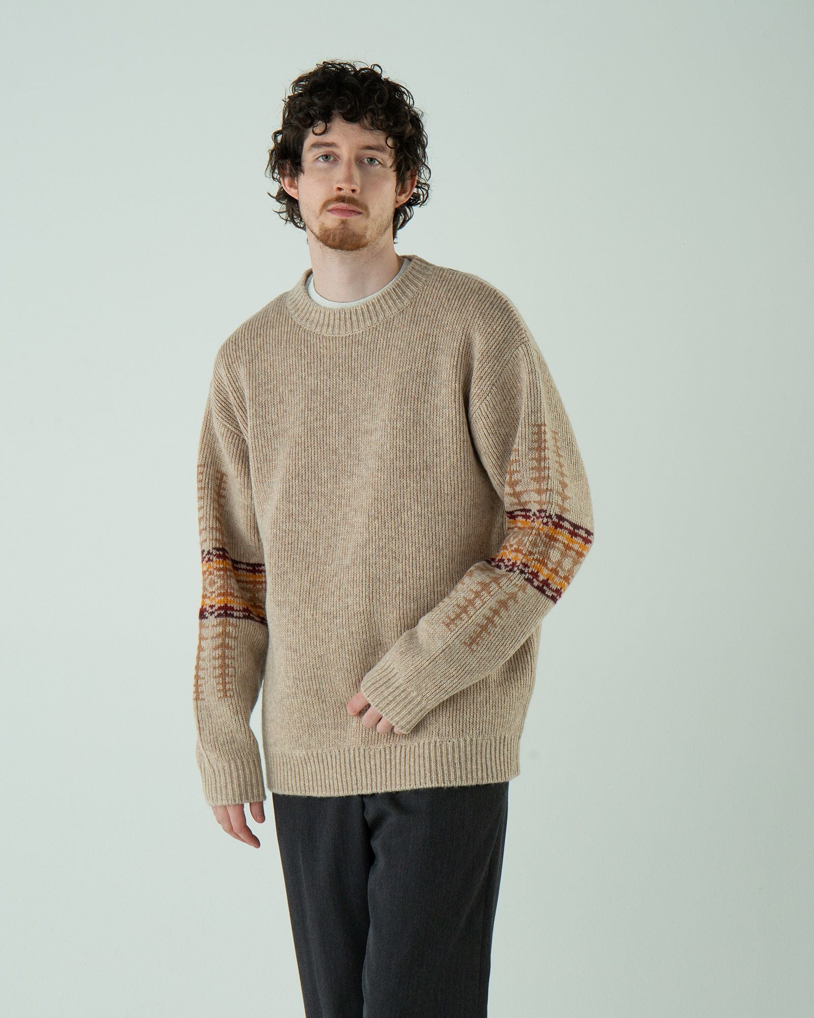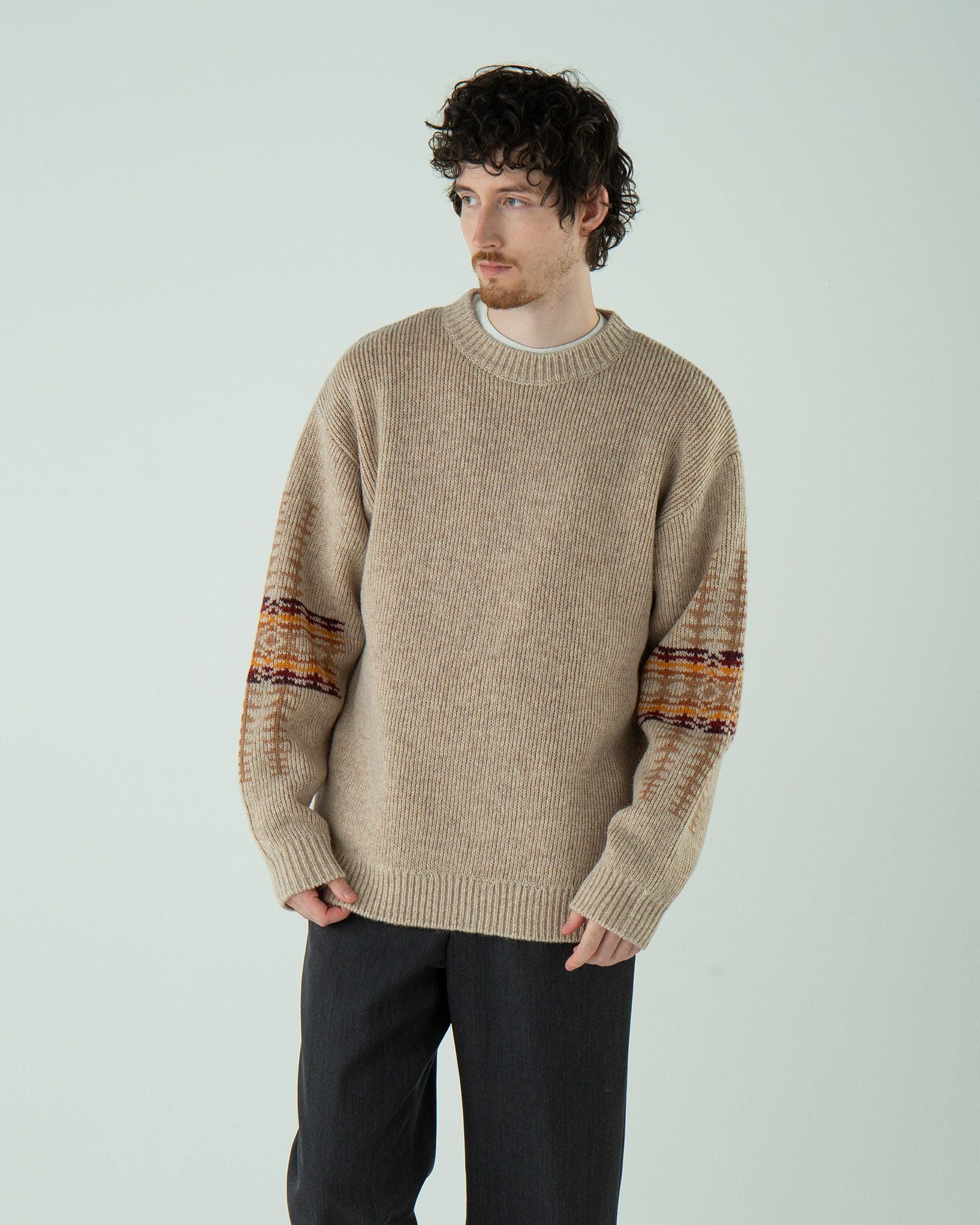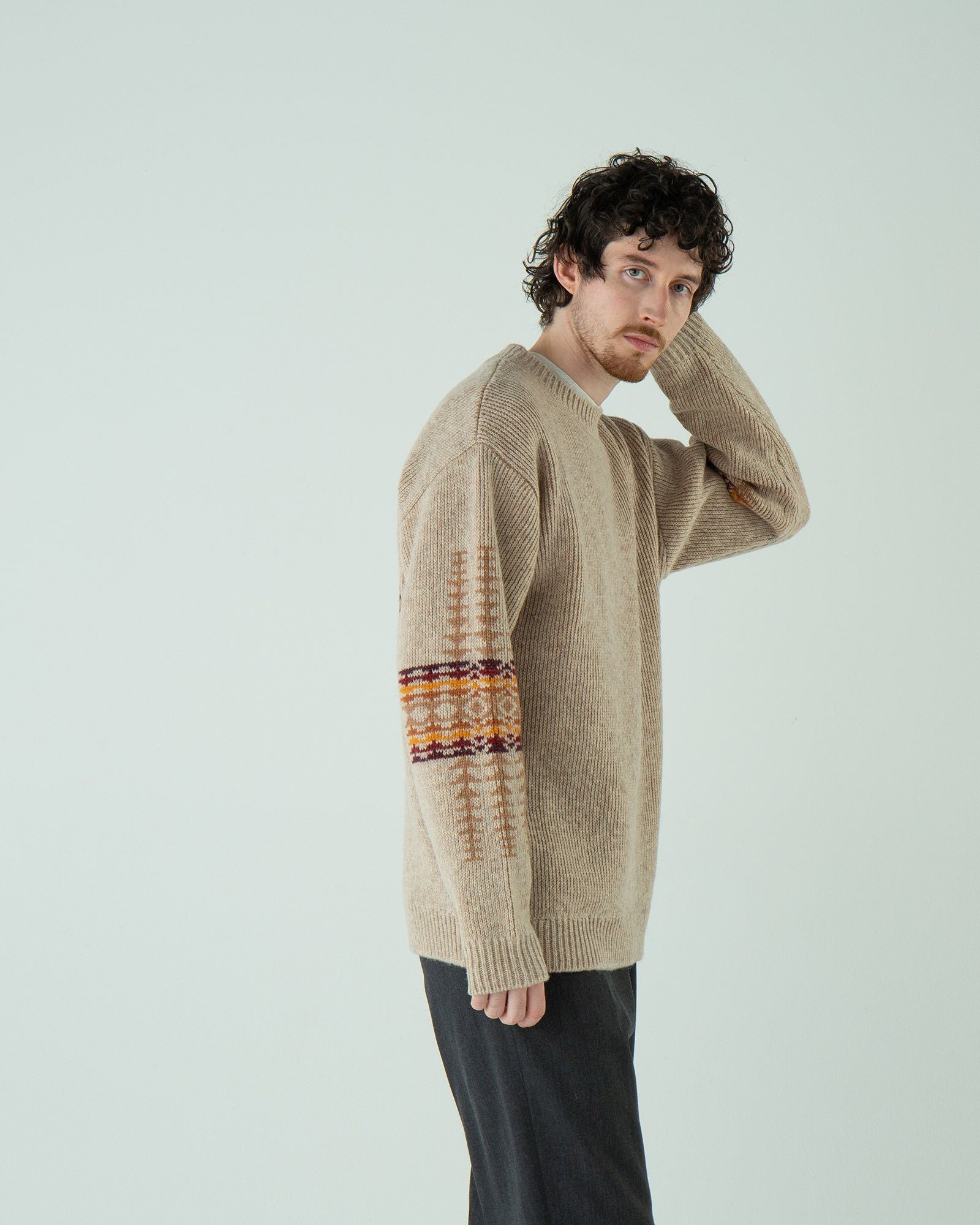 ベーシックな丸首(クルーネック)デザインは、インナーとの相性も抜群。