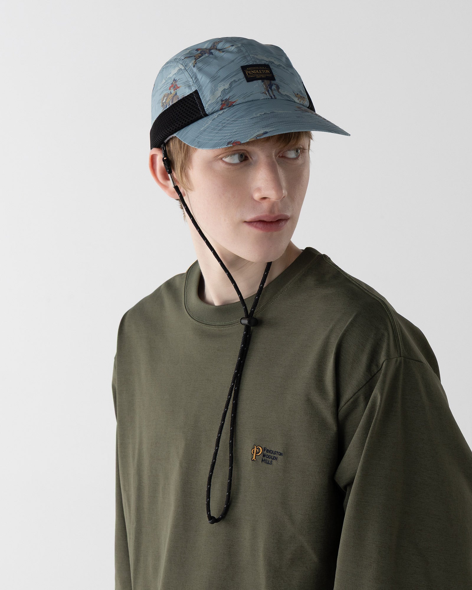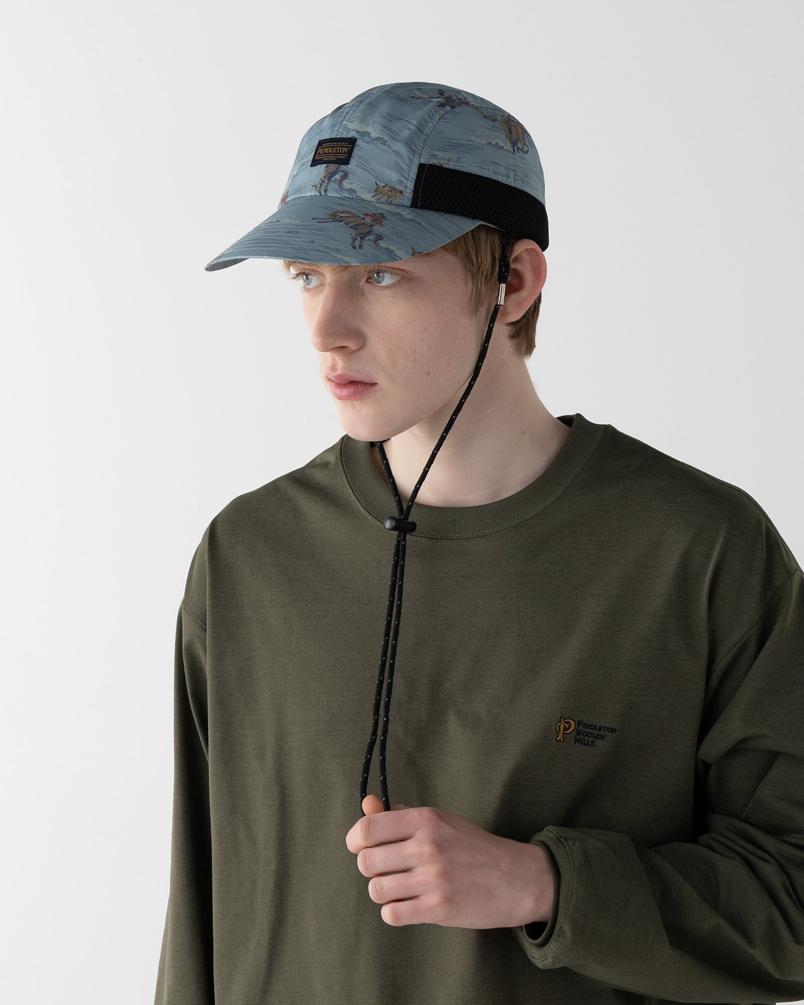のコードが付いており、アゴ下で留めたり、首に掛けたりと、スタイルやシーンに合