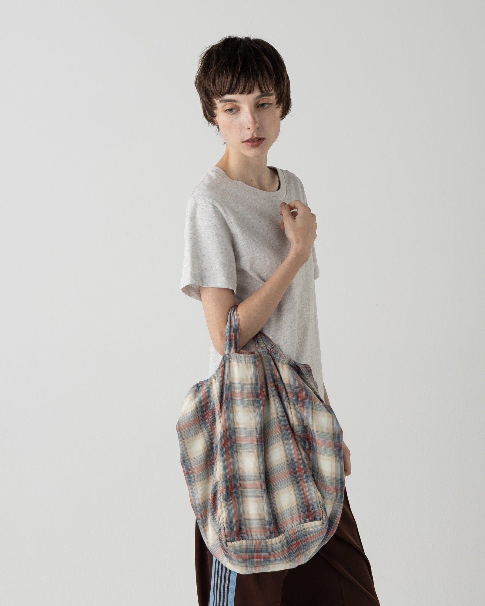 パッチワークチェックが目を引くデザインのため、服やアクセサリーはシンプルにまとめると全体のバランスが良くなります。