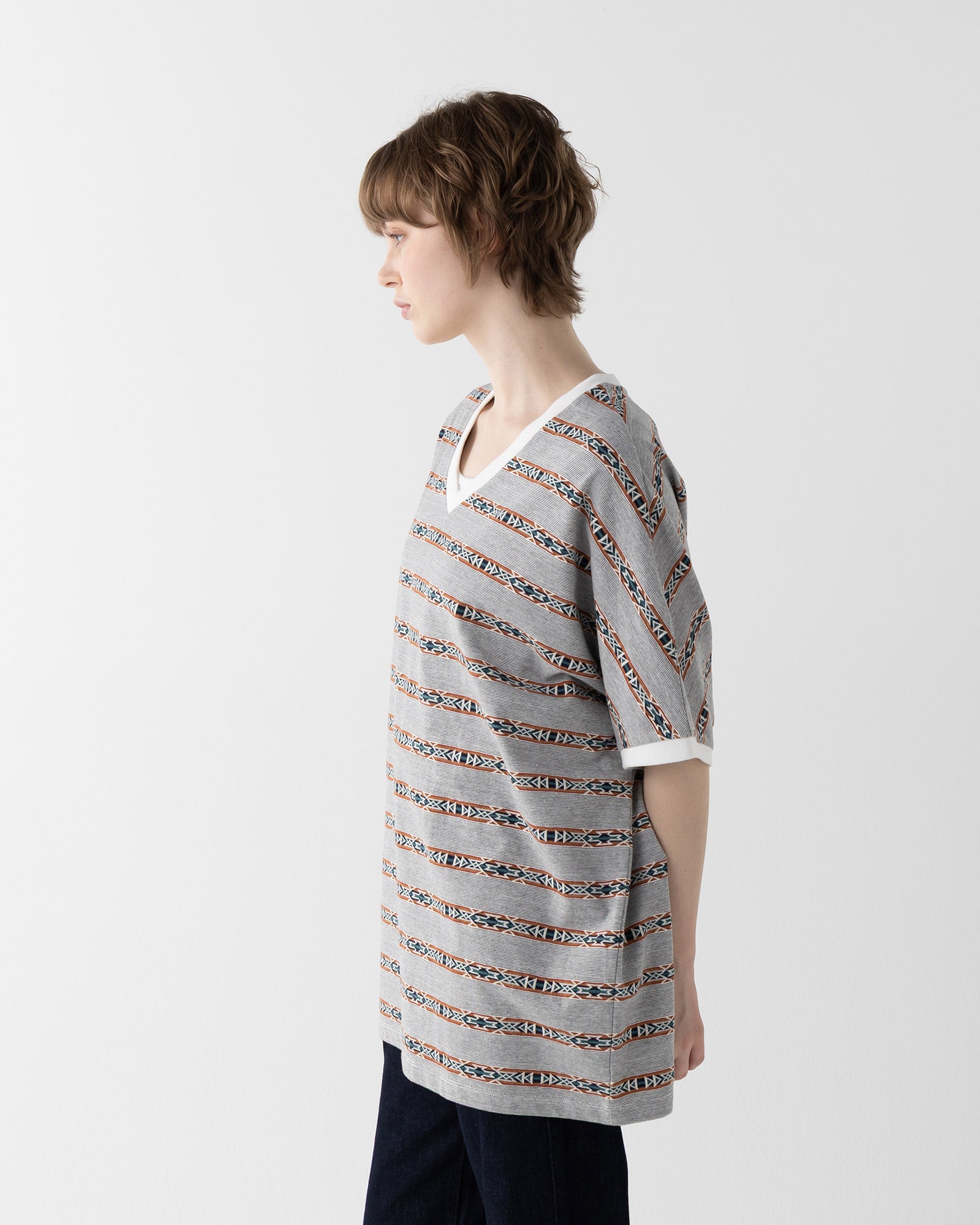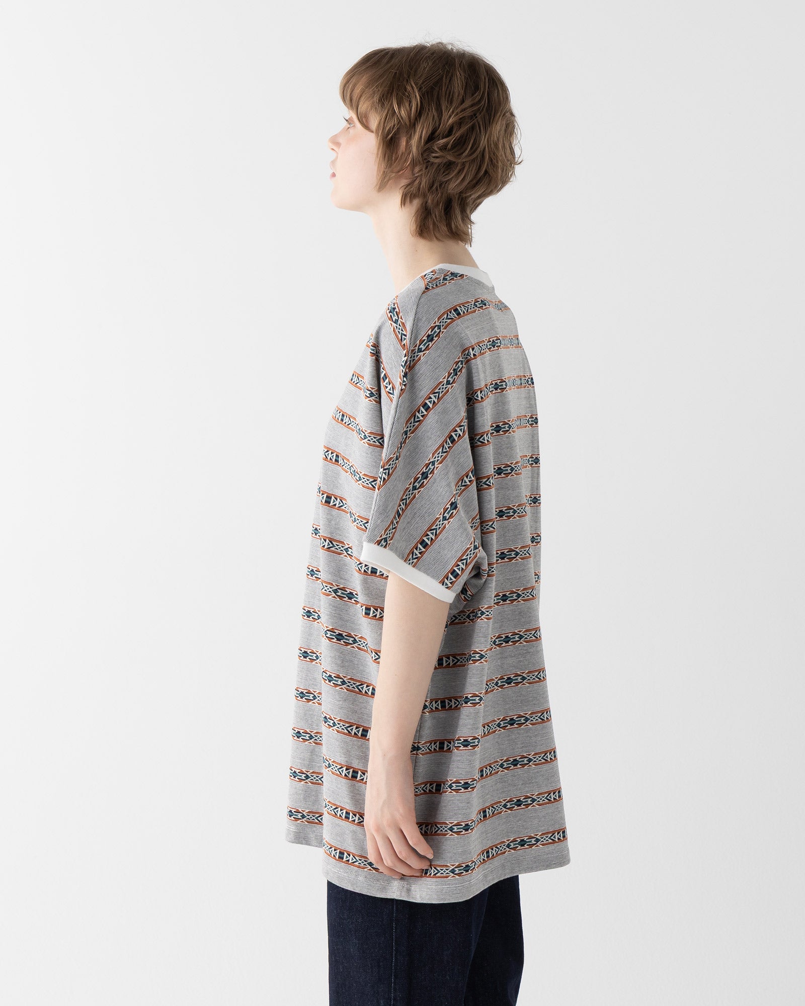 通常のプリントではなく、ジャガード機で編み立てたボーダーパターンが特徴。