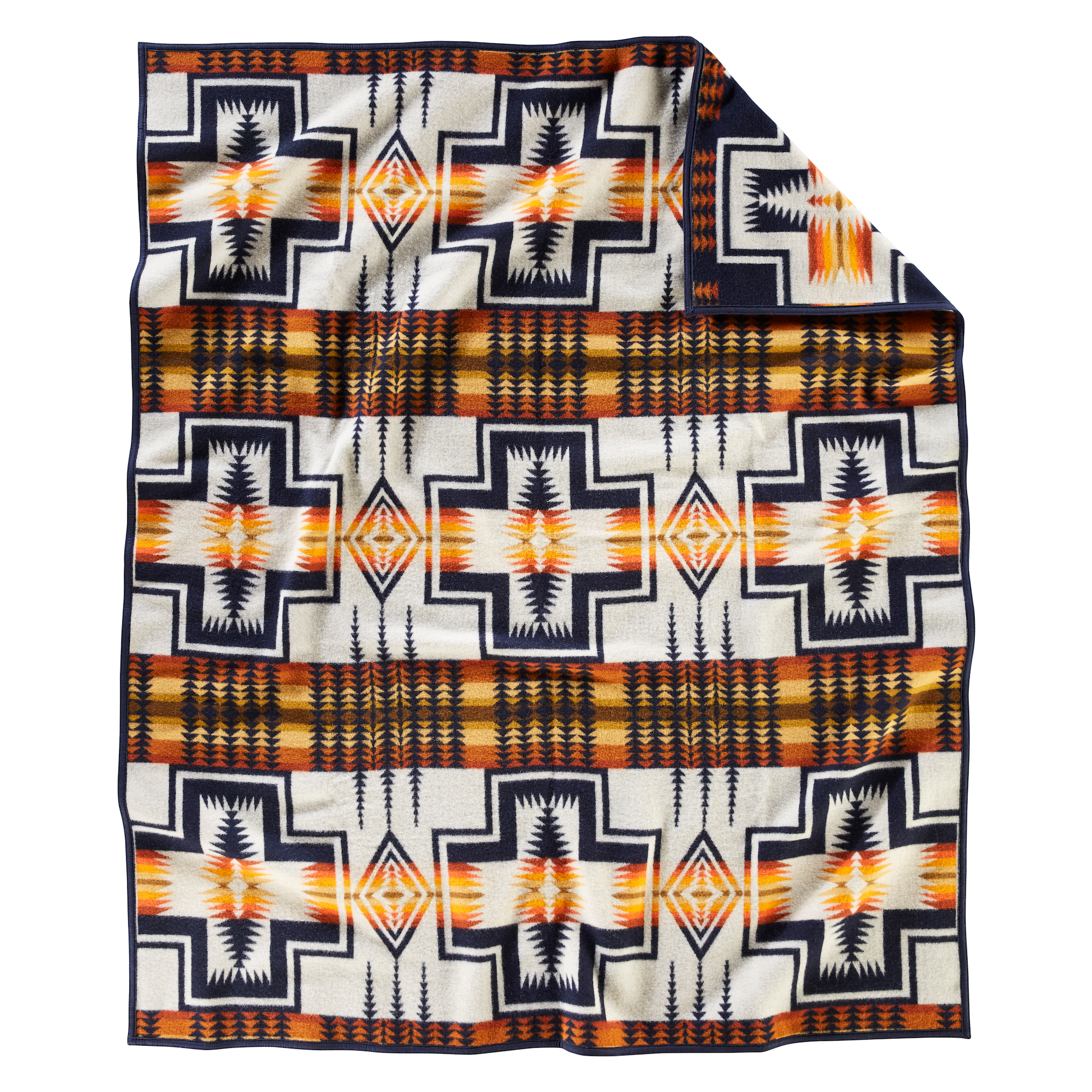 1923年、ウォーレン・G・ハーディング大統領とフローレンス夫人はオレゴン州のブルーマウンテン・カントリーを訪れ、オールド・オレゴン・トレイルの一部を竣工しました。その式典で、カユース族とウマティラ族の指導者たちはハーディング夫人に、ペンドルトンのチーフ・ジョセフ毛布をもとに新しくデザインした毛布を贈りました。柔らかな色合いのこのデザインは、ファーストレディの誠実さと率直な性格を表しており、ネイティブ・アメリカンから非常に尊敬されています。1926年に「ハーディング・ローブ」と名付けられたこのブランケットは、現在もペンドルトン・ウーレン・ミルズが製造する最も人気のある柄のひとつです。